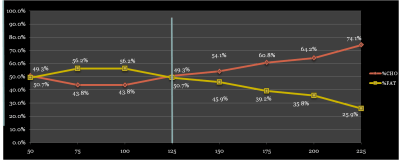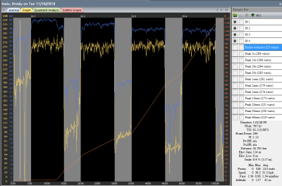 Alright, so for those of you that are out there and interested in the science behind training I will give you an eye into what our nutritionist is currently working on and what I’m able to take a part in. The thought is based off of some work done by Bob Seebohar, however, the goal is to see if there is (and if so what is) the result of doing work at threshold on our Metabolic efficiency. For those of you that don’t know/understand what metabolic efficiency is: roughly it is the amount of work, or in this instance power, that your body is capable of doing while still burning fat as your predominant source of fuel. The purpose behind this is because we have a nearly unlimited amount of fat stores to fuel our body but carbohydrate stores are limited and we can only eat so much in a day. So…the graph below is mine… Apparently right now I’m not super efficient and weird because there shouldn’t be 2 crossover points.